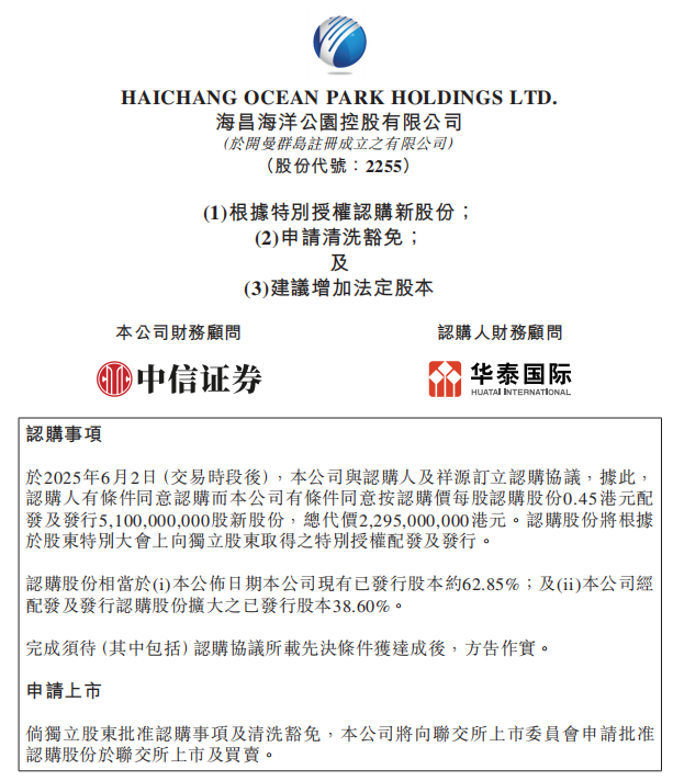 6月2日晚间,海昌海洋公园在港交所发布公告称,祥源控股集团(以下简称“祥源”)以22.95亿港元战略投资海昌海洋公园(以下简称“海昌”)。根据公告,此次交易由祥源间接全资控制的子公司祥源星海旅游(开曼)有限公司拟按0.45港元/股的价格认购海昌海洋公园配发及发行的51亿股新股份。交易完成后,祥源将持有海昌38.6%的股份,成为第一大控股股东。